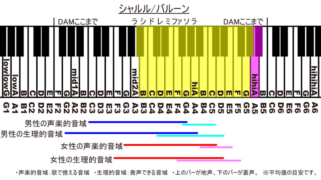 カラオケのDAMでの音域を載せています。